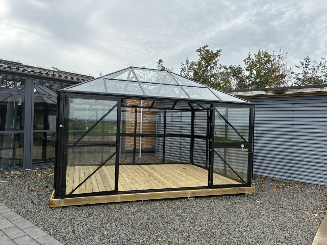 Et drivhus til den kræsne haveejer. hvor alle aluprofiler er pulverlakeret sort.