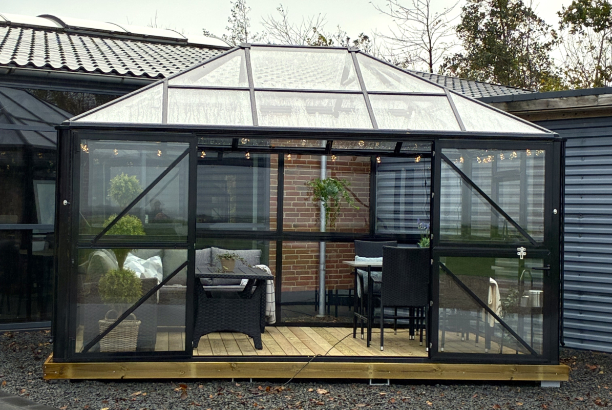 Et drivhus til den kræsne haveejer. hvor alle aluprofiler er pulverlakeret sort.